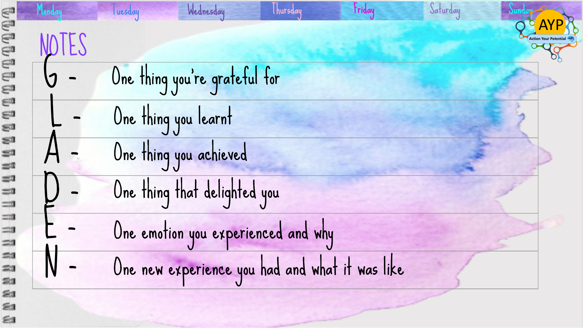 At the end of each day make a journal entry using GLADEN as a mnemonic to help organise your thoughts.
