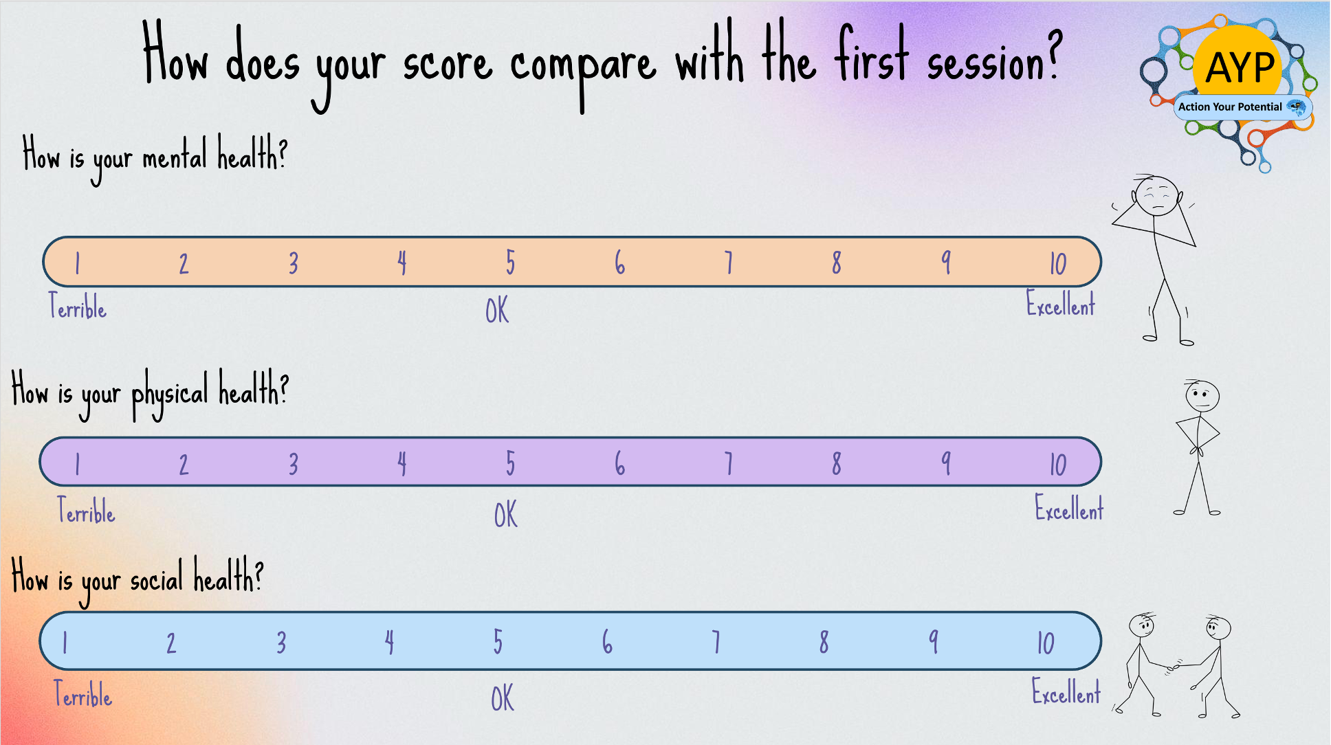 Social Health – how are you feeling about others and your relationship with them. Your kids, spouse, work colleagues, friends.